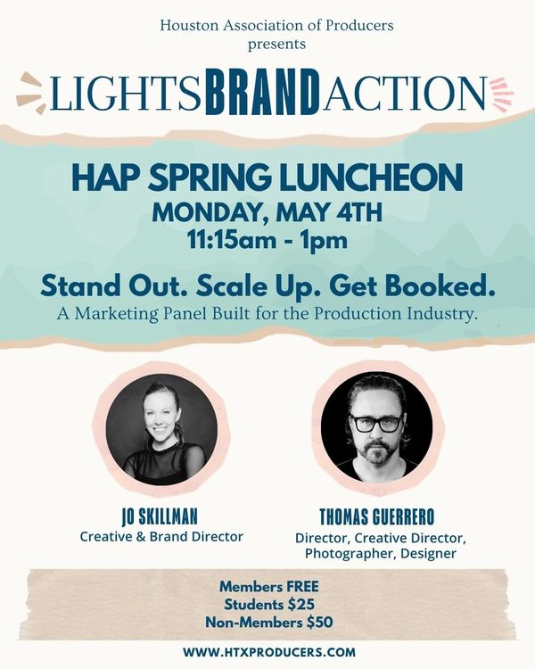 Hear from Jo Skillman, a marketing and brand strategist known for shaping strong, story-driven campaigns, and Thomas Guerrero, one of Houston’s top directors and brand professionals. Together, they’ll share invaluable insight on what it takes to promote yourself with intention and impact.